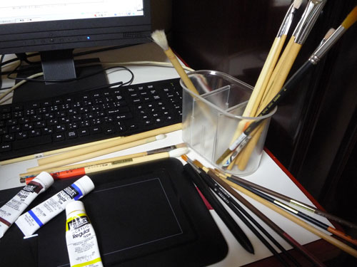 先日アクリルを早速使ってみた。厚塗りがほんとしやすい…のですがずっとリキテックス使ってたので色伸びにもびっくりするんですけど、若干色の発色とかが違うようでそれに戸惑う。いつもの色が出ない…アクリルはアクリルで色の認識を改めてせねばならんようです。混ざり方も違うからよう分からん!しばらくは要所要所で活躍してもらうことにしよう。
